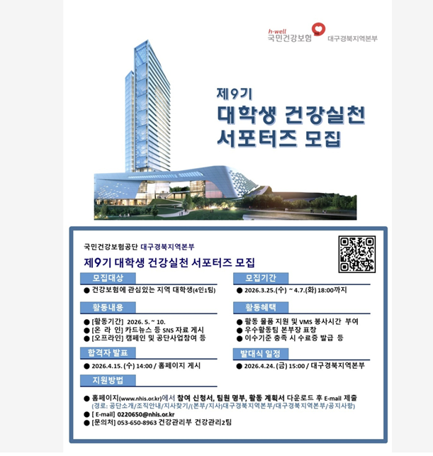 국민건강보험공단 대구경북지역본부에서 2026년 대학생 건강실천 서포터즈를 모집합니다.