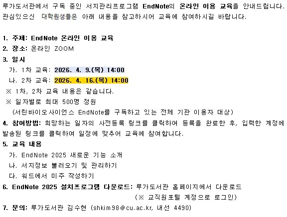 - Endnote 설치프로그램 다운로드(※ 교직원포털 계정 로그인) [클릭]