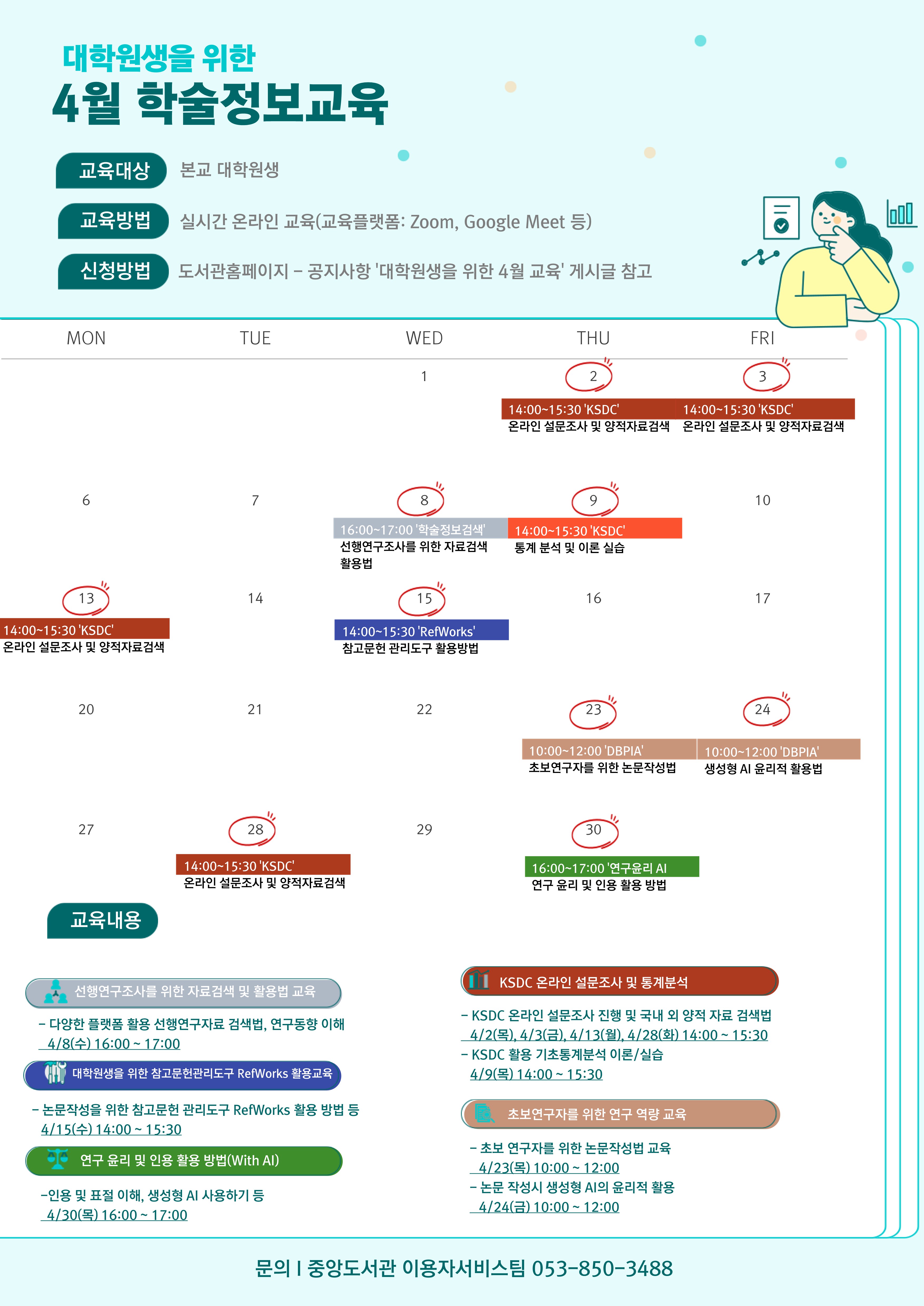 라. 신청방법: 도서관 홈페이지-공지사항-대학원생을 위한 4월 학술정보교육 안내 게시글 참고