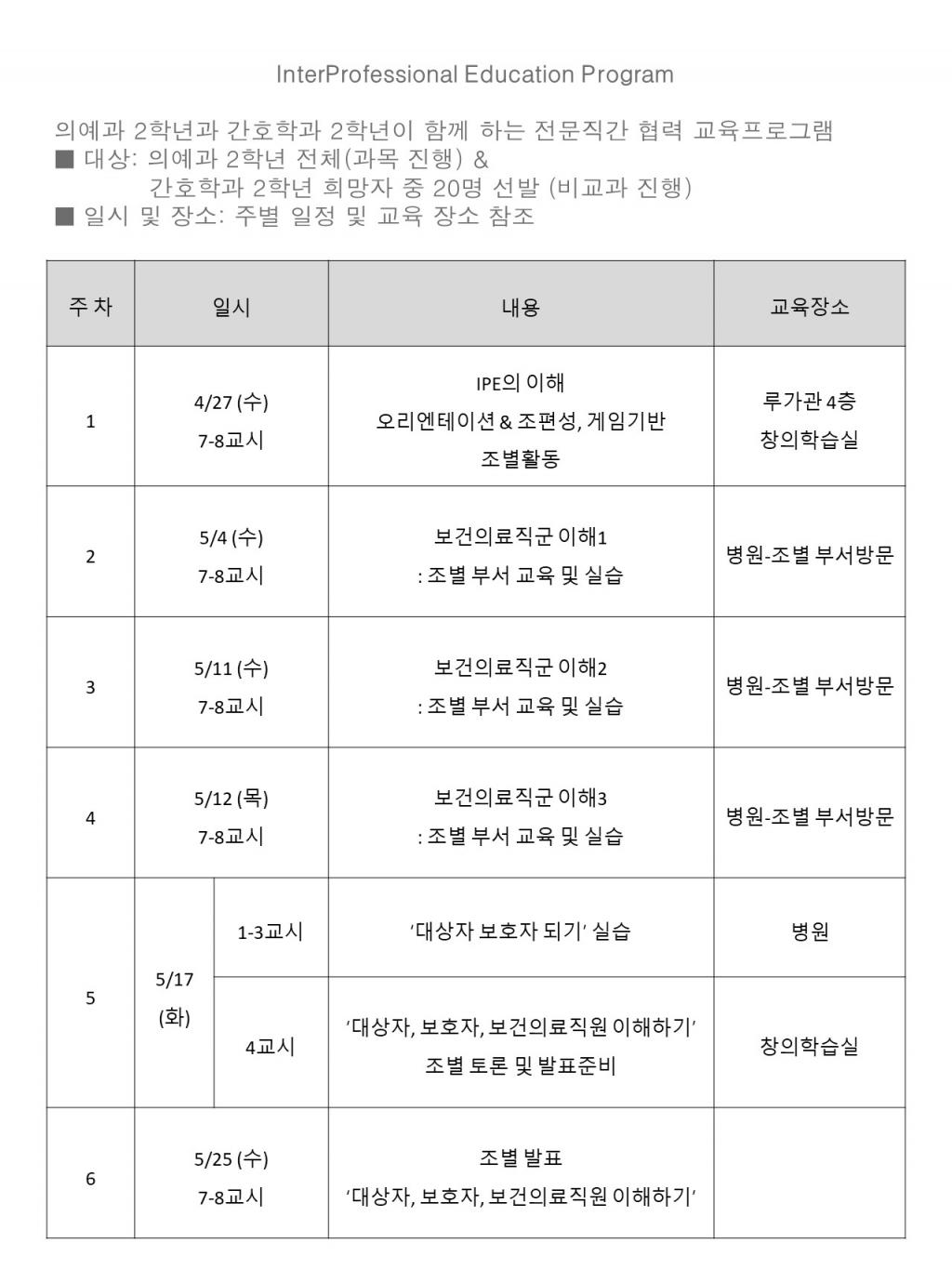 ■ 대상: 의예과 2학년 전체(과목 진행) & 간호학과 2학년 희망자 중 20명 선발 (비교과 진행)